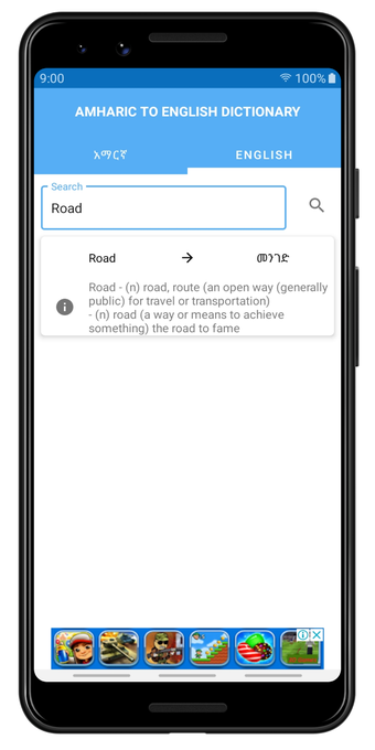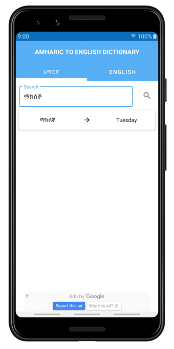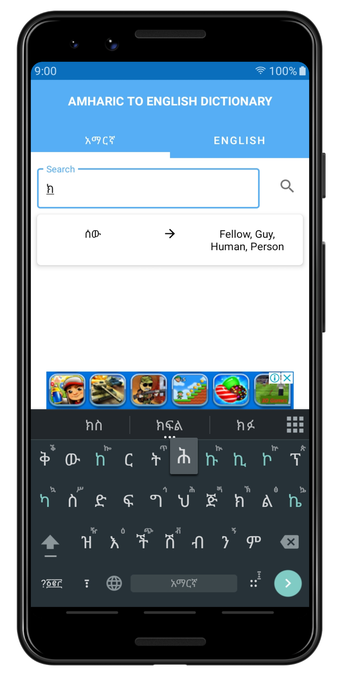 Amaric English Dictionary to słownik offline, który pozwala użytkownikom na wyszukiwanie zarówno angielskich, jak i amharskich słów. Słownik można przeszukiwać za pomocą alfabetów angielskiego i amharskiego. Zapewnia definicje amharskie dla około 40 000 angielskich słów. Ponadto, poprawna wymowa jest podana w literach angielskich i amharskich.